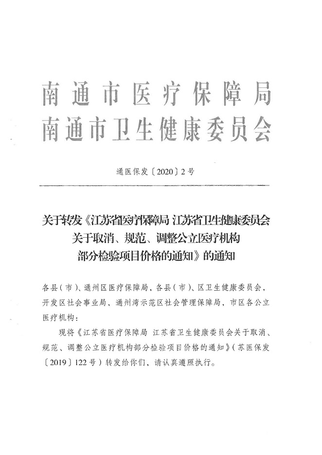 關于轉發江蘇省及南通市關于取消、規范、調整公立醫療機構部分檢驗項目價格政策的通知